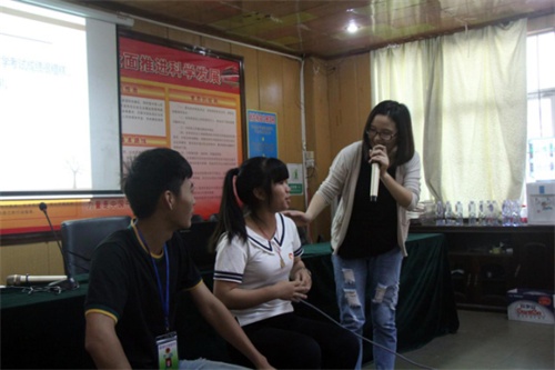 接下来,杨莉莉老师为我们讲解了朋辈辅导的第一个实例,并邀请了两位同学自愿上台进行实例表演,在一场精彩的表演后,杨莉莉老师为我们分析了参与表演的同学们存在的辅导误区,并告诉了我们正确的辅导做法,让我们明白了朋辈辅导员所要具备的正确的态度与做法。