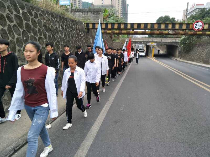 扛着会旗,向烈士陵园出发