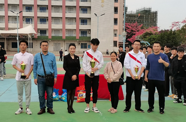 长(左3)为获奖班级颁发奖杯和奖品