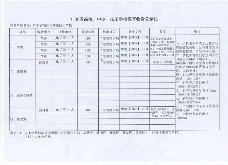 广东省高校、中专、技工学校教育收费公示