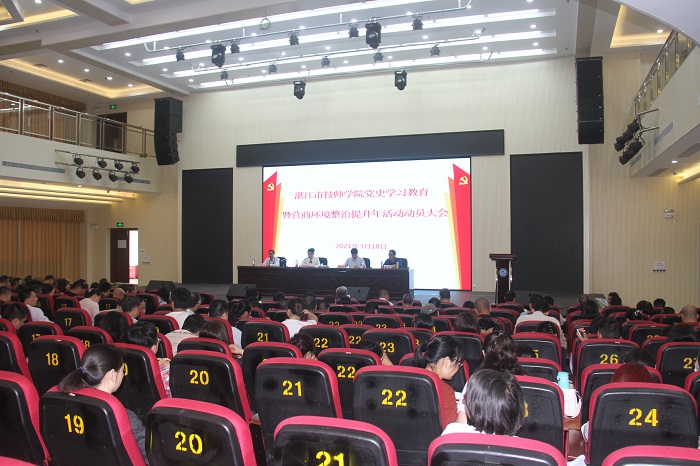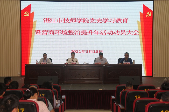 18日下午,湛江市技师学院在新教学综合楼一楼学术报告厅召开党史学习教育暨“营商环境整治提升年”活动动员大会,深入贯彻学习习近平总书记在党史学习教育动员大会上的重要讲话精神,按照中央《关于在全党开展党史学习教育的通知》要求,紧密结合学校改革发展实际,对学校开展党史学习教育进行动员部署。学校党委书记、校长江宇静同志出席会议并作动员讲话,副校长陈钢华、副校长罗斌,校长助理廖振及学校全体教职员工参加大会,会议由陈钢华副校长主持。